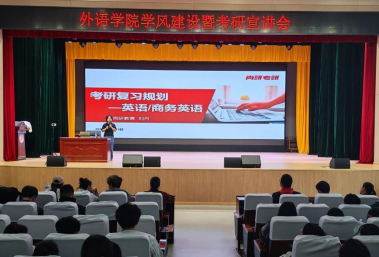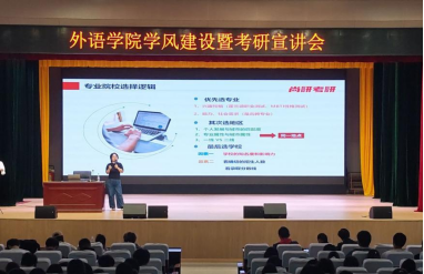 为助力学生科学规划考研路径,明晰备考方向,10月15日下午,外语学院在江南校区大礼堂成功举办学风建设暨考研宣讲会。本次活动特邀尚研教育讲师刘丹担任主讲嘉宾,外语学院党总支书记肖红香、院长张哲华、学工办主任梁博文、辅导员刘思晨及外语学院部分无课学生参加讲座。宣讲会由团总支书记孟莉主持。