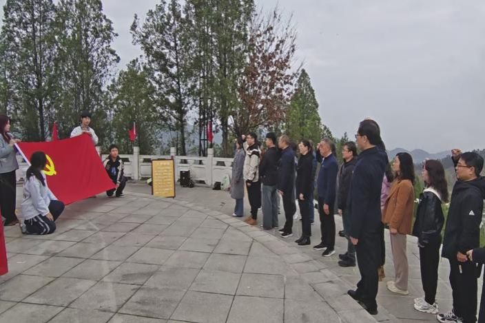 活动现场,支部全体党员怀着崇敬之心肃立在牛蹄岭战争纪念碑前,高唱《中华人民共和国国歌》。激昂的旋律在苍松翠柏间回荡,不仅唤醒了党员们对革命历史的记忆,更点燃了心中的爱国热忱与育人激情。随后,外语学院党总支副书记、院长张哲华受邀带领支部党员举起右拳,庄严重温入党誓词。铮铮誓言响彻遗址上空,既是对革命先辈的深切告慰,更是支部党员坚守教育初心、勇担育人使命的坚定承诺。宣誓结束后,全体党员依次向革命先烈默哀致敬,并缓步上前敬献鲜花,以庄重的仪式表达对英烈的无限崇敬与深切缅怀。