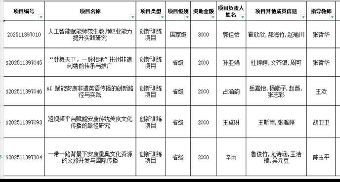 近日,根据学校发布的《关于2025年大学生创新创业训练计划项目立项的通知》,外语学院在2025年大学生创新创业训练计划项目中获批立项5项,其中国家级项目1项,省级4项。
