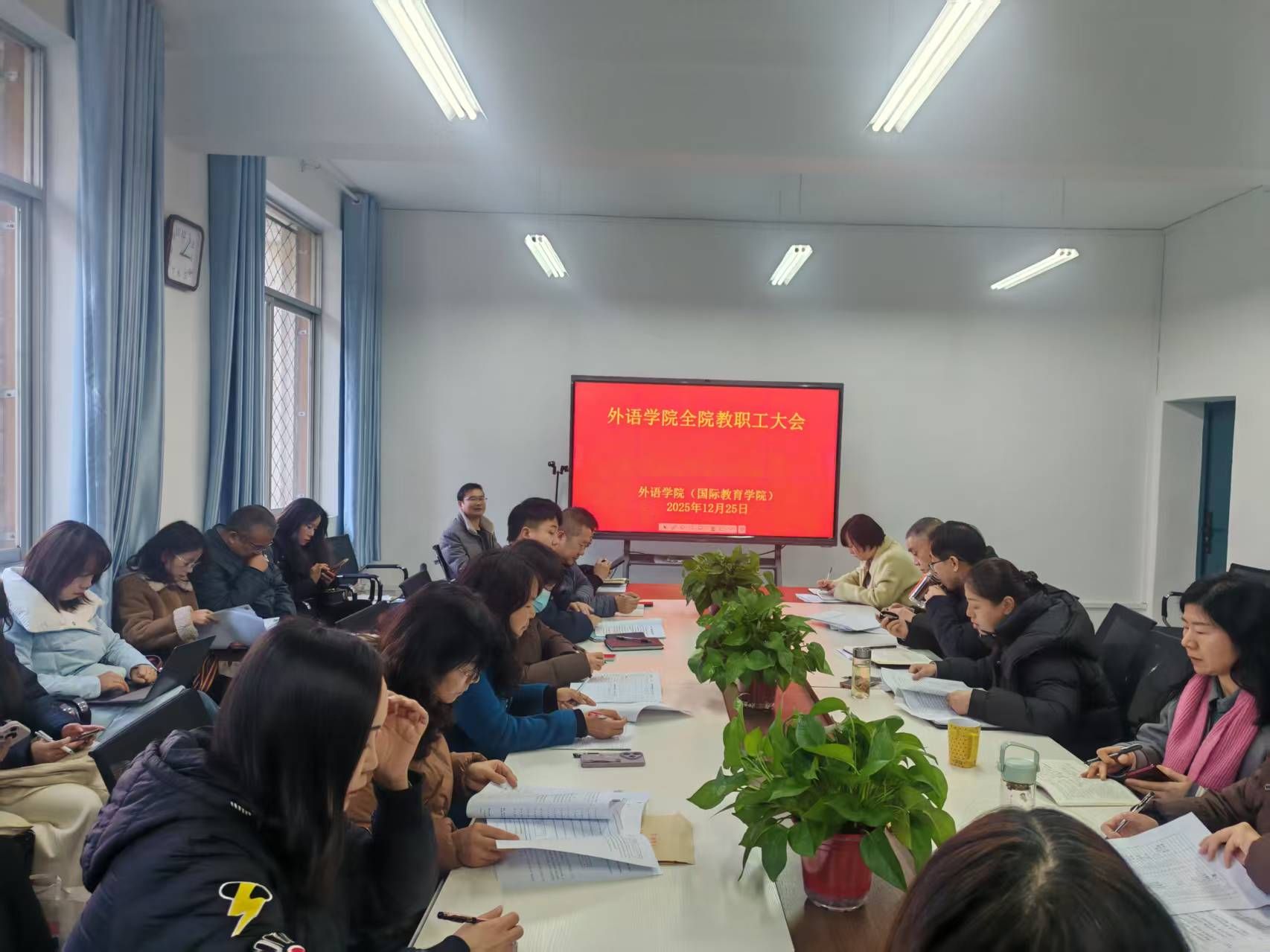 12月25日,外语学院在6208会议室召开全院教职工大会,会议由学院党总支书记肖红香主持。