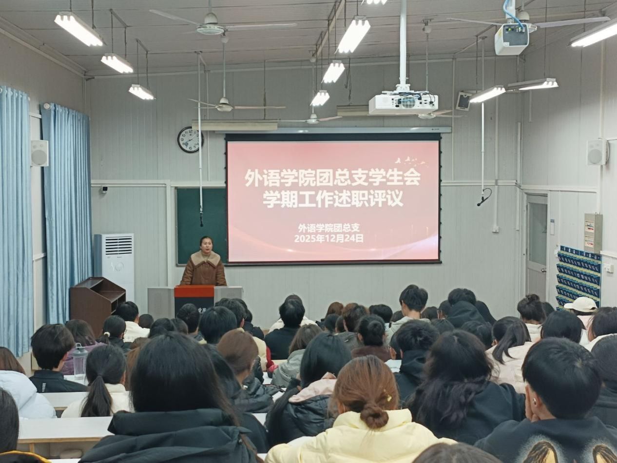 为进一步强化学生骨干队伍建设,总结工作成效、夯实服务根基。12月24日晚,外语学院团总支学生会在6405教室召开2025-2026学年第一学期述职评议会。外语学院团总支学生会全体成员参加会议。会议由学院团总支书记孟莉主持。