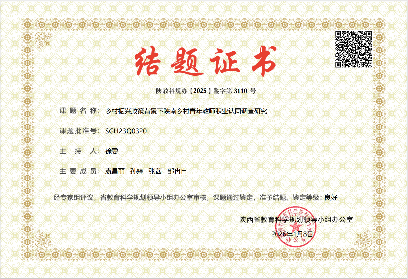 两项课题立足陕南乡村教育实际,分别从育人体系构建与教师专业发展两个关键维度开展实证研究,为推动乡村教育内涵发展与质量提升提供了重要的理论依据与实践参照。两项课题的顺利完成,进一步体现了我院教师聚焦现实问题、服务区域发展的研究导向与学术担当。未来,我院将继续支持基于地方教育需求的深度研究,为乡村振兴与教育现代化持续贡献智慧与力量。